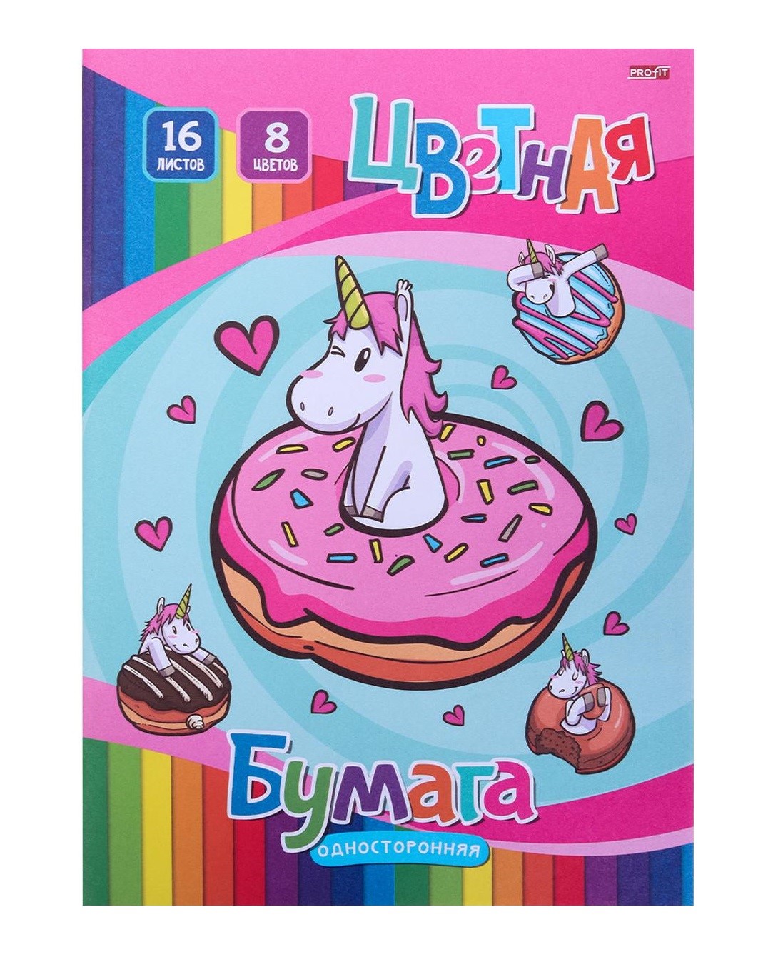 TM»Profit»НАБОР ДЛЯ ДЕТ.ТВОР.Бумага цв. одн. 16л. (ЕДИНОРОГИ И ПОНЧИКИ)скр,16л,8ц. 193х280 /РОССИЯ/