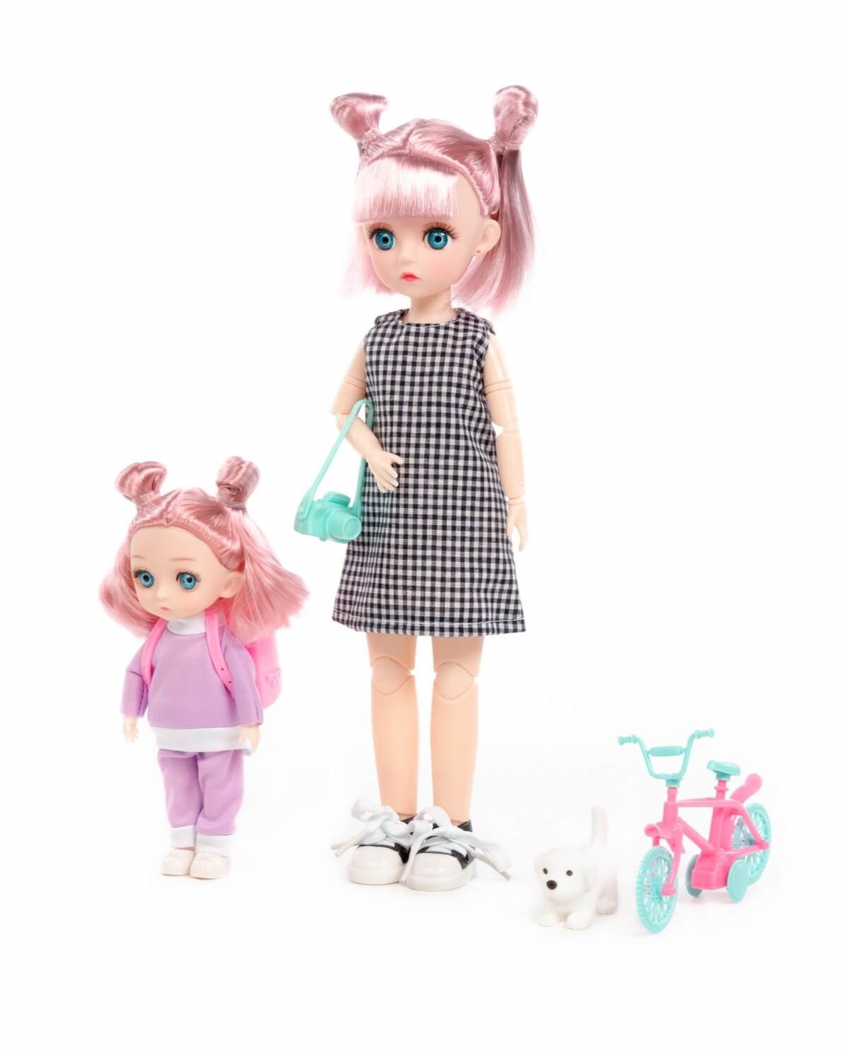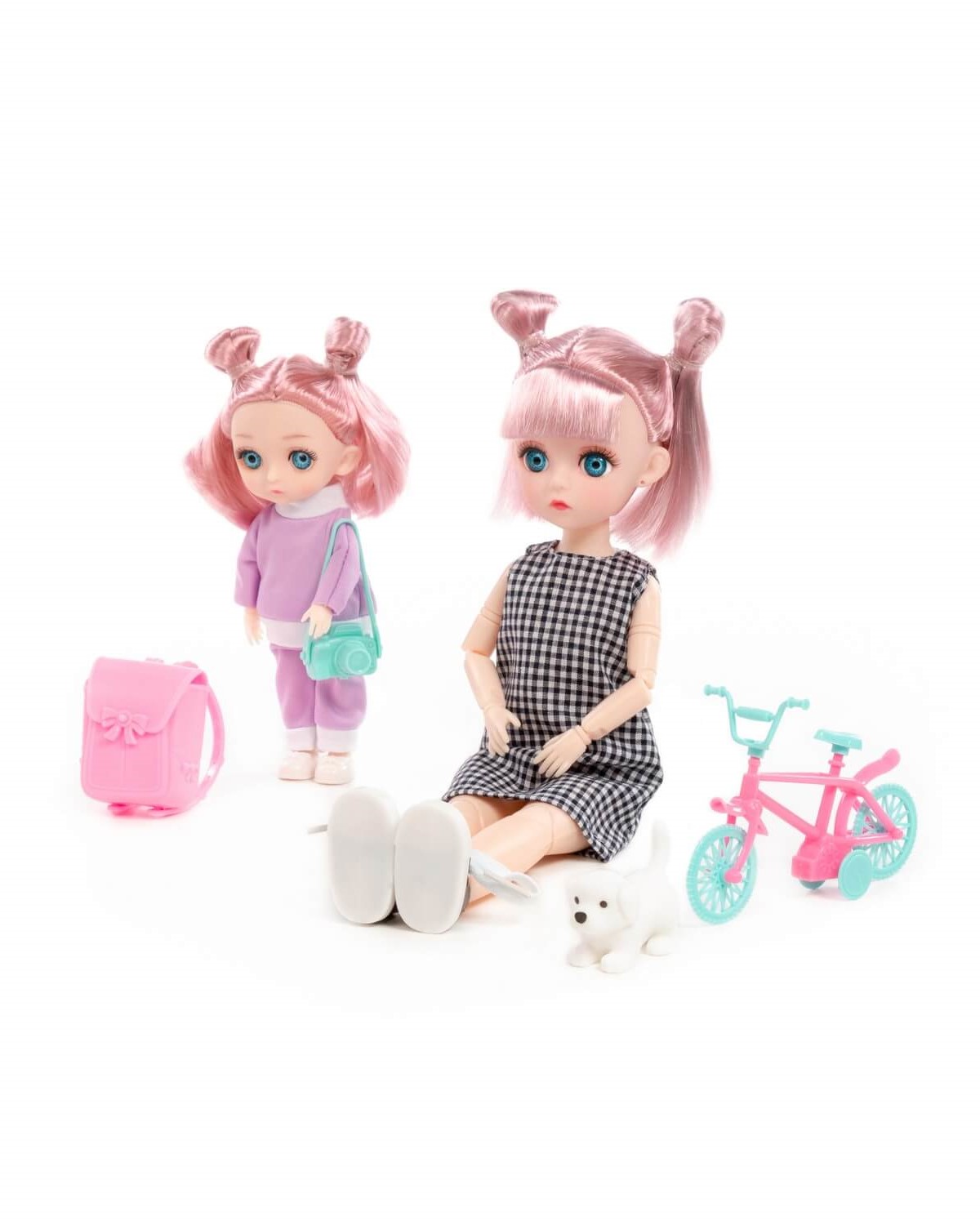 Идеальный тандем – Маша и Даша, куклы, которые станут прекрасным подарком для маленькой модницы. Игрушки имеют выразительный взгляд, пышную прическу и яркий наряд. Руки, ноги и голова кукол могут принимать практически любую естественную человеческую позу благодаря наличию 13 точек артикуляции. В наборе с куклами идут игрушечный велосипед, стильная сумка и фотоаппарат, являющиеся незаменимыми атрибутами любой прогулки на свежем воздухе. А любимый питомец станет идеальным спутником на кукольной прогулке. Благодаря наличию тематических аксессуаров ребенок может придумать множество необычных и интересных сценариев игры. Время, проведенное с куклами, «помогает малышу развивать воображение, мелкую моторику, пространственное и ассоциативное мышление. Проигрывая различные ситуации, ролевые модели, ребенок получает возможность развития своих коммуникативных навыков.