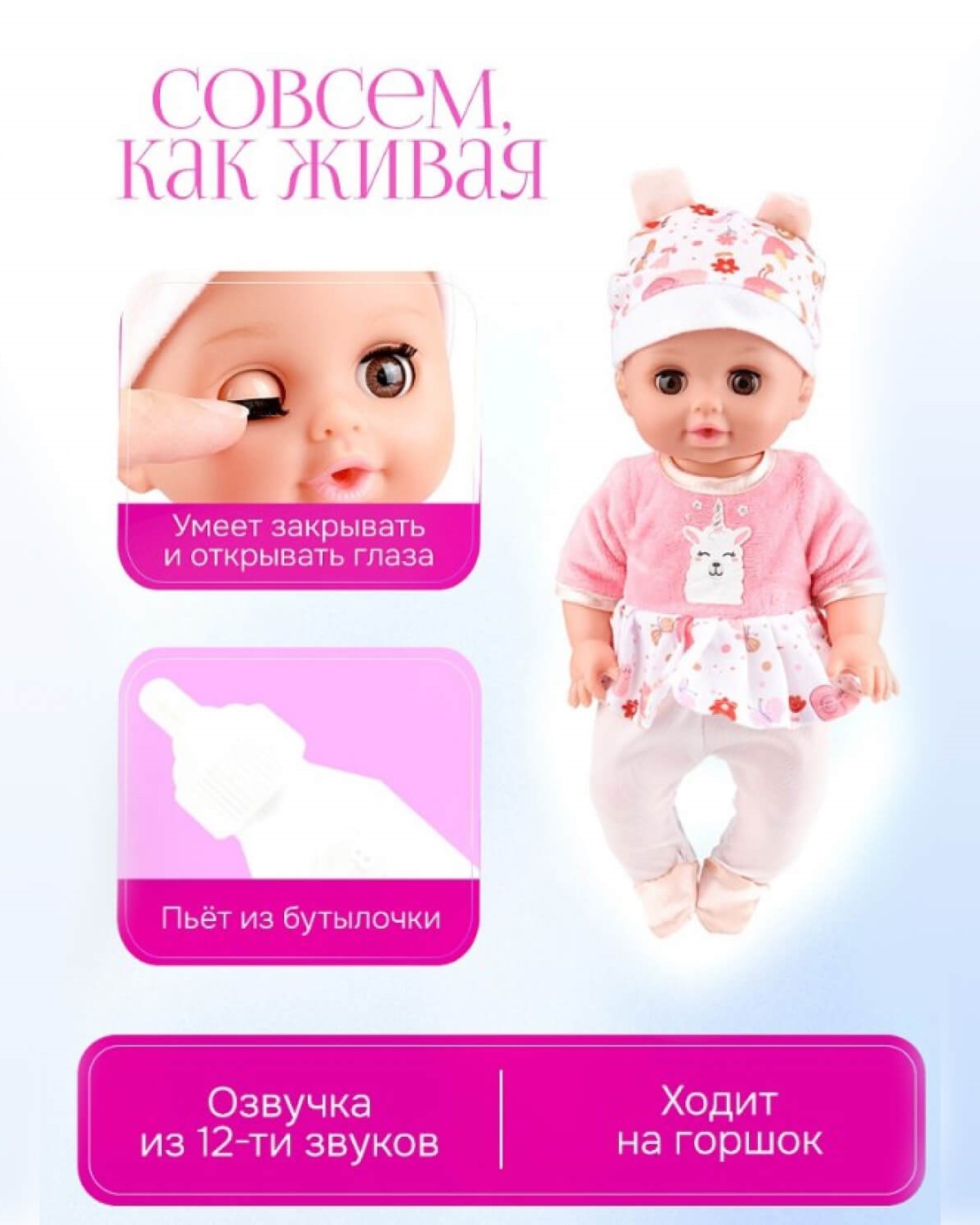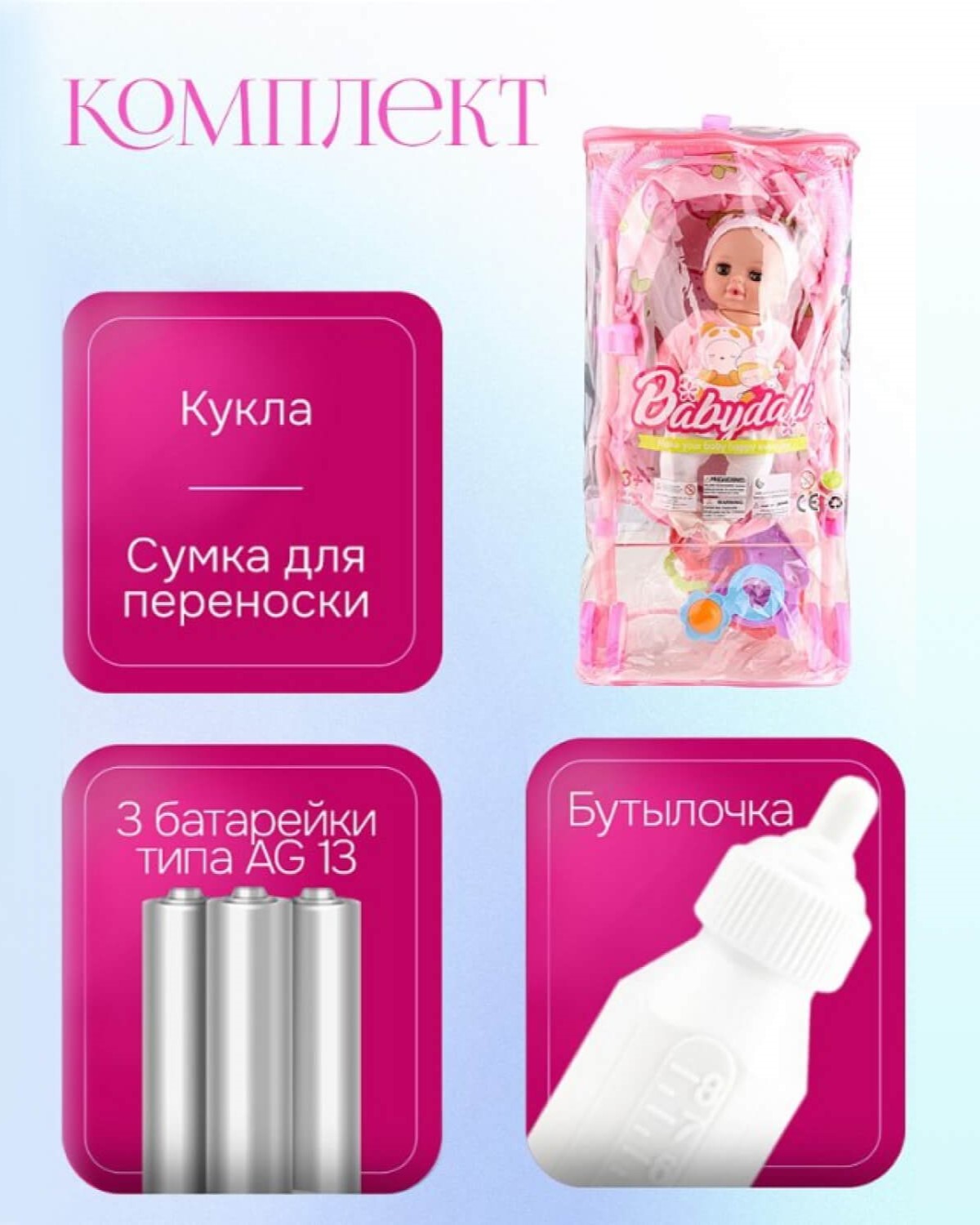 Размер 19,3 х 34,1 х 14,1 см. Пупс «Анжелика» придется по душе вашей малышке! Сюжетно-ролевые игры — важная часть развития ребёнка. Играя в куклы, девочки не только развивают фантазию, но и моделируют разные жизненные ситуации, проживают их и ищут свой способ решать конфликты, сопереживать, строить отношения. Чем больше таких игрушек, тем более сложный мир можно создать! Работает от батареек. Материал: пластик, текстиль. Особенности: пьет, писает, со звуком, закрывает глаза, имеет озвучку из 12 звуков. Аксессуары: горшок, подгузник (12х12 см), тарелочка (9,5 см) с ложкой (8 см) и вилкой (8 см), нагрудник (12х9 см), соска (4 см), погремушка — 2 шт (10х5 см), бутылочка (9 см), музыкальный детский стульчик. В многоразовой сумке.