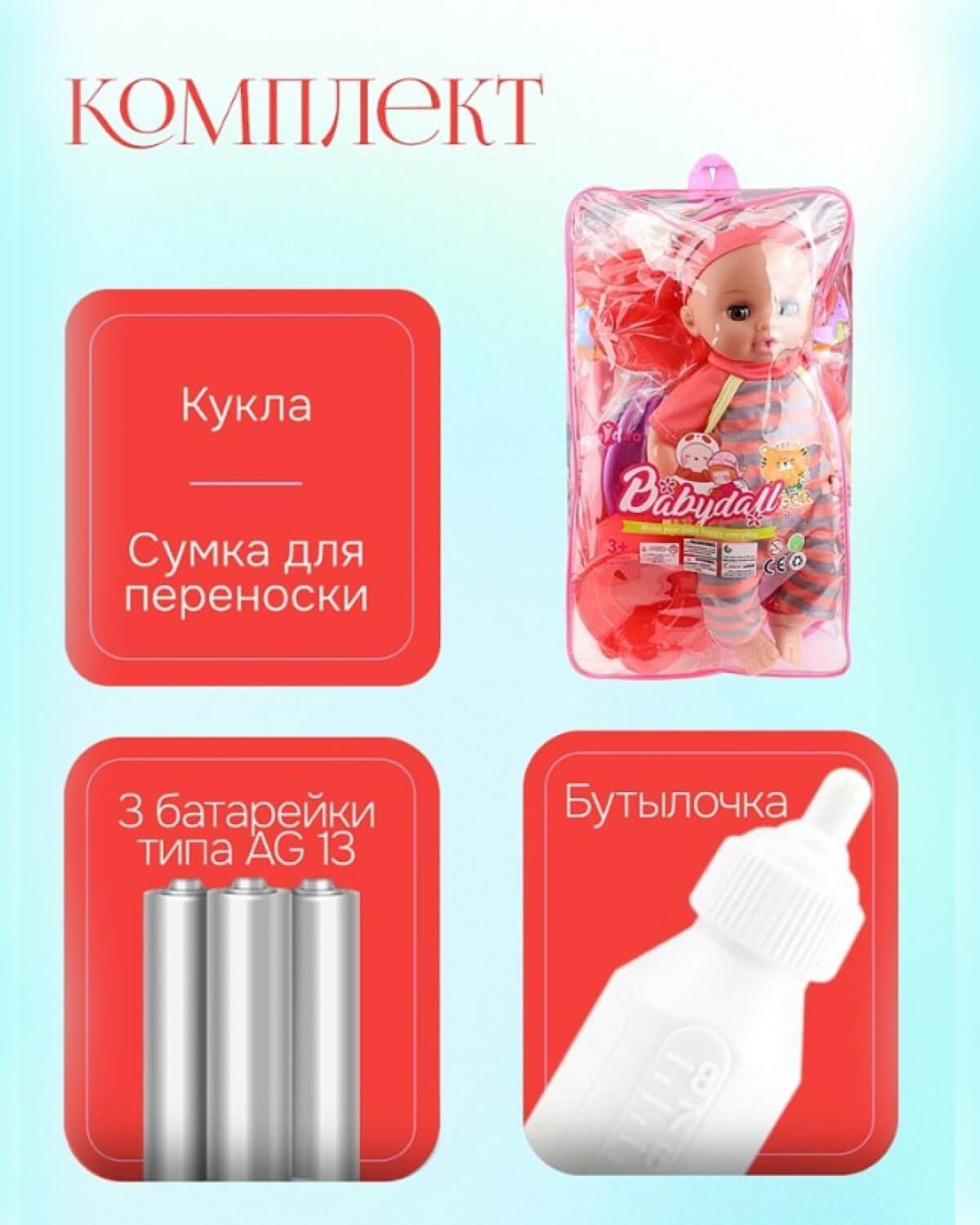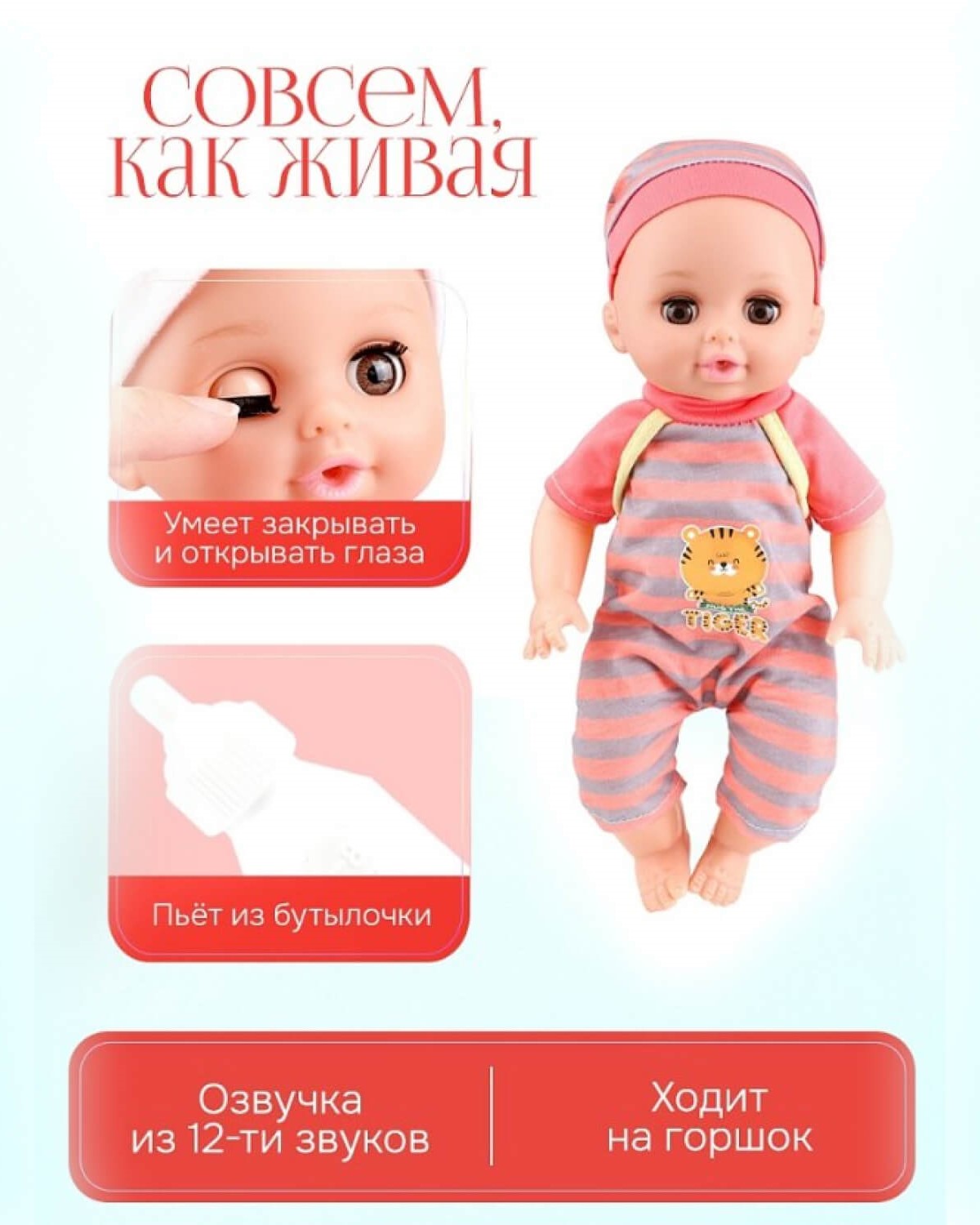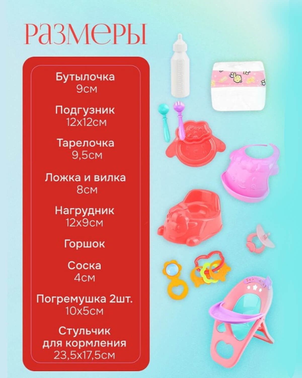 Размер 21,7 х 34,1 х 15,2 см. Пупс «Мой малыш» придется по душе вашей малышке! Сюжетно-ролевые игры — важная часть развития ребёнка. Играя в куклы, девочки не только развивают фантазию, но и моделируют разные жизненные ситуации, проживают их и ищут свой способ решать конфликты, сопереживать, строить отношения. Чем больше таких игрушек, тем более сложный мир можно создать! Работает от батареек. Материал: пластик, текстиль. Особенности: пьет, писает, со звуком, закрывает глаза, имеет озвучку из 12 звуков. Аксессуары: горшок, подгузник (12х12 см), тарелочка (9,5 см) с ложкой (8 см) и вилкой (8 см), соска (4 см), погремушка — 2 шт (10х5 см), бутылочка (9 см), детский стульчик для кормления (длина столика 17,5 см, длина стульчика 23,5 см). В многоразовой сумке.
